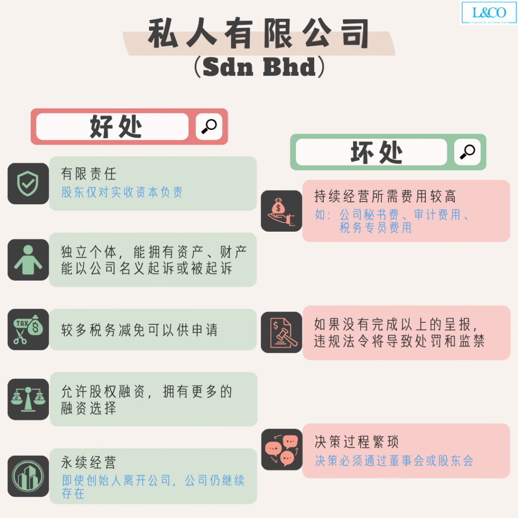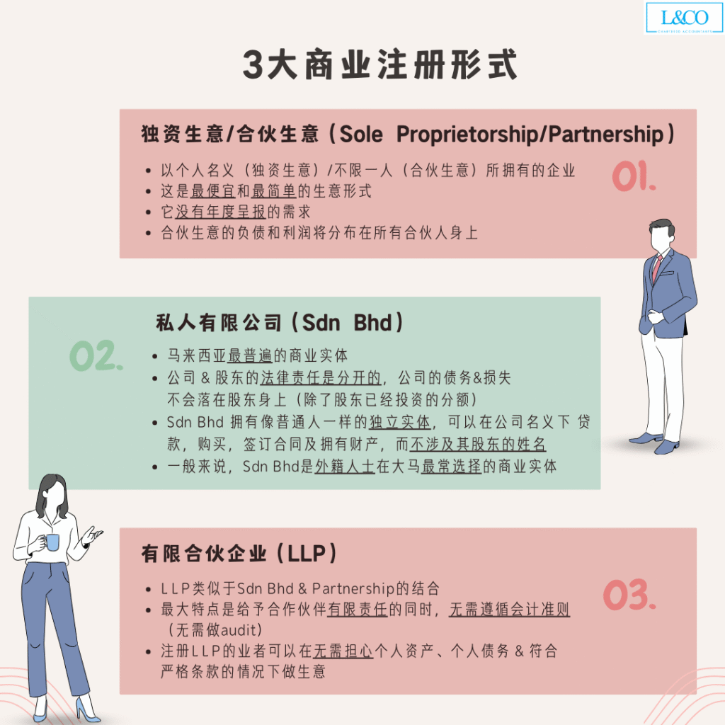 而Sdn Bhd最受外资和中大型企业欢迎,LLP适合专业人士,如律师和会计师事务所等。
