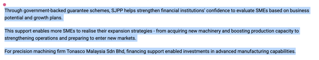 2026年3月6日,《The Straits Times》报道了一篇文章:“Malaysia Government-backed SJPP boosts SME funding access”,文章指出,政府担保计划正在显著提升金融机构向中小企业放贷的意愿。条款包括如下,